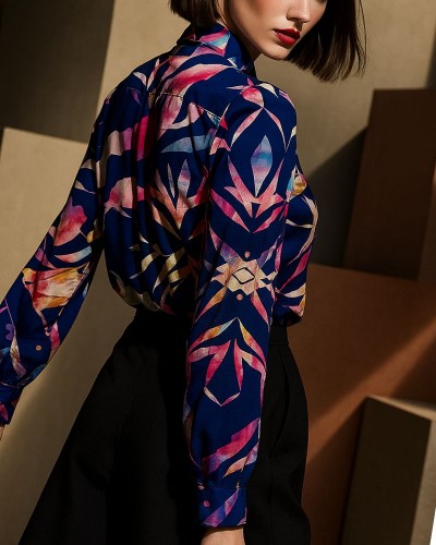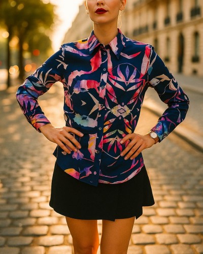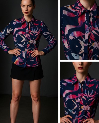 Camasa are o croiala clasica si usor cambrata, cu maneci lungi si guler clasic. Se inchide cu ajutorul unui rand de nasturi delicati de culoare mov, care se potrivesc perfect cu tonurile multicolore ale imprimeului.