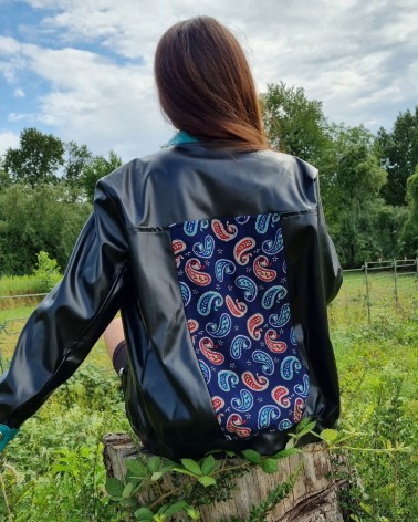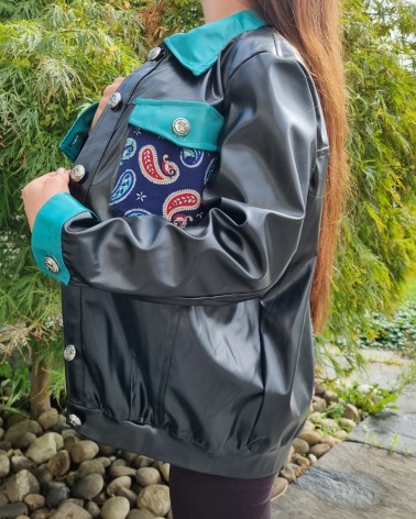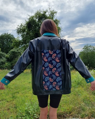 Geaca din piele ecologica neagra & turcoaz cu aplicatie paisley din bumbac