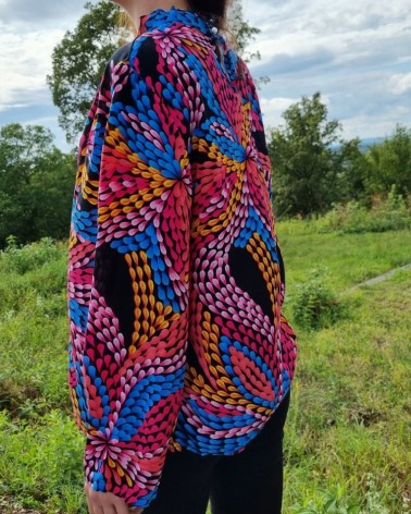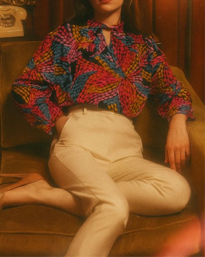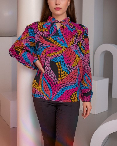 Adaugă o pată de culoare garderobei tale cu această bluză vibrantă din vascoză. Confectionată pe comandă din material moale și ușor, această bluză are o croială dreaptă, guler răsucit elegant și se închide cu un nasture la spate. Imprimeul multicolor te va face să ieși în evidență, indiferent de ocazie.