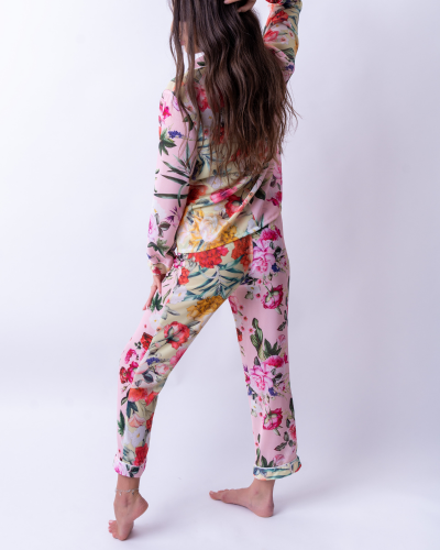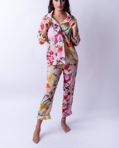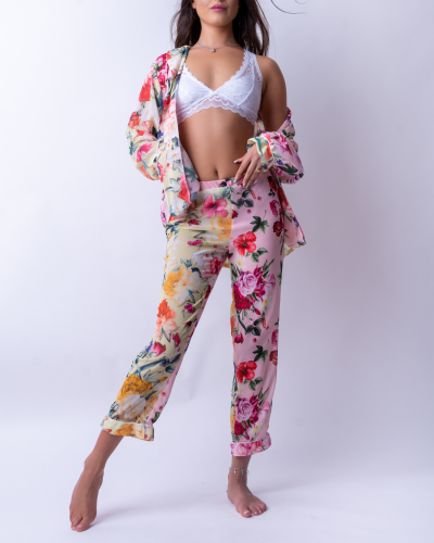 Imaginează-ți o plimbare prin grădina ta secretă, înconjurată de flori parfumate și culori vibrante. Acum transformă această imagine în realitate cu pijamaua noastră din voal fin, cu imprimeu floral și design patchwork.