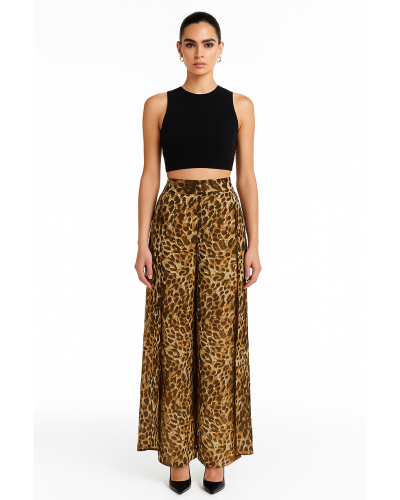 Transformă fiecare pas în declarație de stil. Pantalonii noștri evazați, realizați manual, cu imprimeu leopard, sunt fluizi, îndrăzneți și semi-transparenți pentru un plus de mister și rafinament. Lejeri și spectaculoși, sunt creați să se miște odată cu tine — combinația perfectă între confort și energie statement.