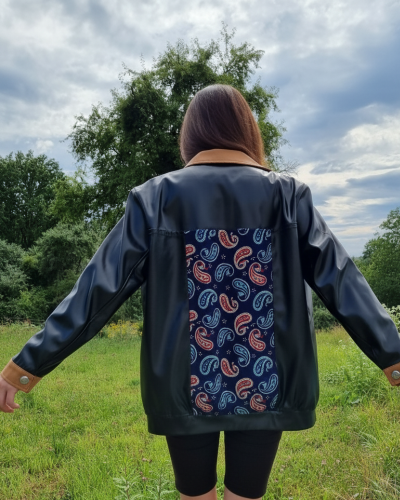 Geaca din piele ecologica neagra & camel cu aplicatie paisley din bumbac